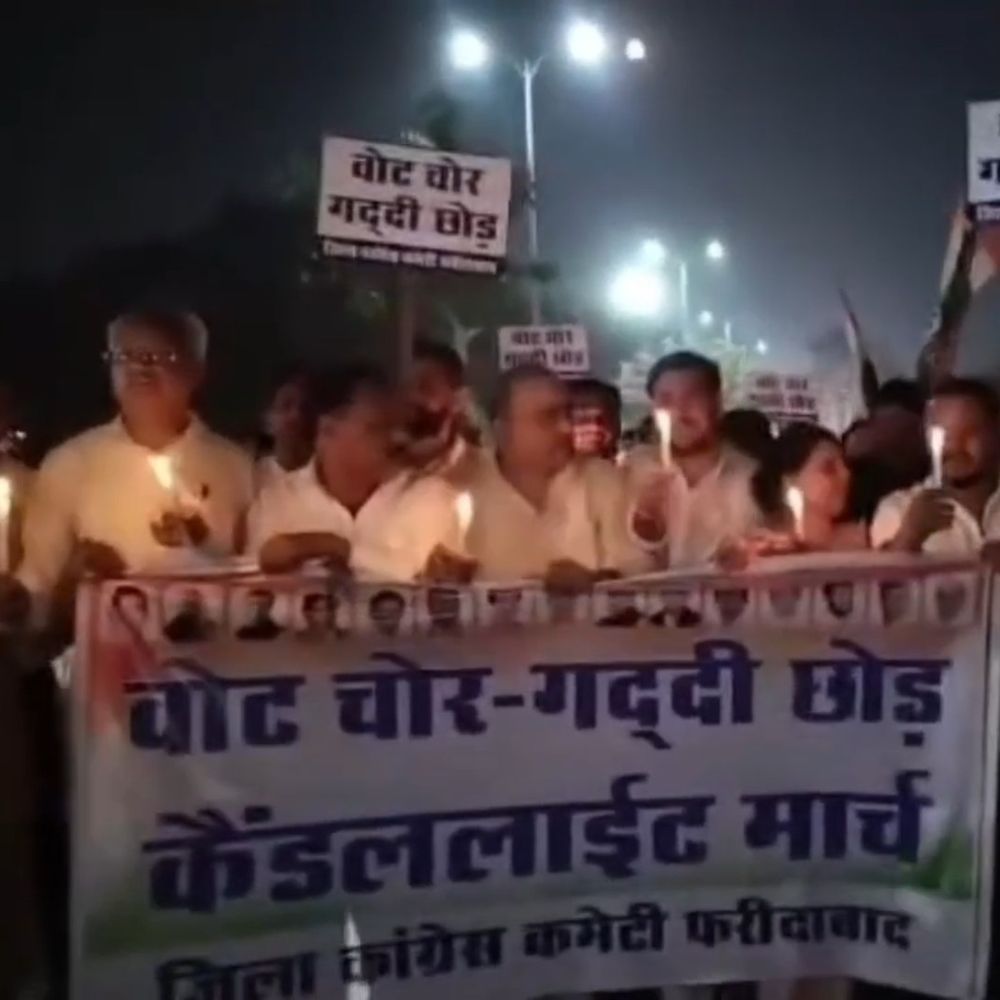 लोकसभा में विपक्ष के नेता और कांग्रेस सांसद राहुल गांधी ने आज हरियाणा विधानसभा चुनाव 2024 में वोट चोरी पर प्रेस कॉन्फ्रेंस की। राहुल ने कई खुलासे करते हुए आरोप लगाया कि चुनाव में धांधली हुई है। अब इसको लेकर पूरे हरियाणा में कांग्रेस कार्यकर्ताओं ने प्रदर्शन किया। राहुल की पीसी के बाद आज शाम 7 बजे जिला कांग्रेस कमेटी फरीदाबाद के अध्यक्ष बलजीत कौशिक के नेतृत्व में कांग्रेस कार्यकर्ताओं ने नीलम चौक से बीके चौक तक लगभग 500 मीटर का कैंडल मार्च निकालकर भाजपा सरकार के खिलाफ जोरदार विरोध प्रदर्शन किया। भाजपा ने वोट चोरी से सत्ता हथियाई- कांग्रेस इस मौके पर जिलाध्यक्ष बलजीत कौशिक ने कहा कि हरियाणा में कांग्रेस की सरकार बन रही थी, लेकिन भाजपा ने वोट चोरी कर सत्ता हथिया ली। उन्होंने कहा कि वह पहले से ही हर मंच पर भाजपा पर वोट चोरी के आरोप लगाते आए हैं, और अब राहुल गांधी ने तथ्यों और प्रमाणों के साथ यह साबित कर दिया है कि हरियाणा में भाजपा ने फर्जी वोटों के माध्यम से सरकार बनाई। कौशिक ने गंभीर आरोप लगाते हुए कहा कि भाजपा ने वोट चोरी में विदेशियों को भी नहीं छोड़ा। उन्होंने एक ब्राजील की मॉडल की तस्वीर दिखाते हुए कहा कि इस महिला की तस्वीर का उपयोग करके हरियाणा में फर्जी वोट बनाए गए। यह मॉडल कभी “स्वीटी” तो कभी “सीमा” के नाम से 22 बार वोट डालती रही। यह बात देश के लोकतंत्र के लिए बेहद शर्मनाक और खतरनाक है। जिलाध्यक्ष बोले- राहुल ने सारे राज खोल दिए जिलाध्यक्ष कौशिक ने कहा कि राहुल गांधी ने संसद में प्रमाणों के साथ बताया कि हरियाणा में 25,41,144 फर्जी वोटों के जरिए चुनाव परिणामों को प्रभावित किया गया। राहुल गांधी ने यह भी खुलासा किया कि मुख्यमंत्री नायब सिंह सैनी का एक वीडियो सामने आया है, जिसमें वे कहते नजर आ रहे हैं कि “सरकार बनाने की व्यवस्था हो चुकी है।” यह बयान अपने आप में वोट चोरी की सच्चाई उजागर करता है। कांग्रेस के विरोध प्रदर्शन की PHOTOS…