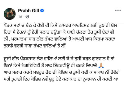 ਪੰਜਾਬੀ ਸੰਗੀਤ ਜਗਤ ਵਿੱਚ ਆਪਣੀ ਸੁਰੀਲੀ ਆਵਾਜ਼ ਅਤੇ ਸਾਊ ਸੁਭਾਅ ਲਈ ਜਾਣੇ ਜਾਂਦੇ ਪ੍ਰਭ ਗਿੱਲ ਹਾਲ ਹੀ ਵਿੱਚ ਪੌਡਕਾਸਟਾਂ ਵਿੱਚ ਨਾਮਵਰ ਕਲਾਕਾਰਾਂ ਪ੍ਰਤੀ ਕੀਤੀ ਜਾ ਰਹੀ ਅਲੋਚਨਾ ਨੂੰ ਲੈ ਕੇ ਕਾਫ਼ੀ ਨਾਰਾਜ਼ ਨਜ਼ਰ ਆਏ। ਗਾਇਕ ਨੇ ਆਪਣੇ ਅਧਿਕਾਰਤ ਫੇਸਬੁੱਕ ਅਕਾਊਂਟ ਰਾਹੀਂ ਉਨ੍ਹਾਂ ਲੋਕਾਂ ਅਤੇ ਪੌਡਕਾਸਟ ਹੋਸਟਾਂ ਨੂੰ ਕਰੜੇ ਹੱਥੀਂ ਲਿਆ ਹੈ, ਜੋ ਸਿਰਫ਼ ਚਰਚਾ ਵਿੱਚ ਰਹਿਣ ਲਈ ਕਲਾਕਾਰਾਂ ਦੀ ਸਖ਼ਤ ਮਿਹਨਤ ਦਾ ਨਿਰਾਦਰ ਕਰਦੇ ਹਨ।