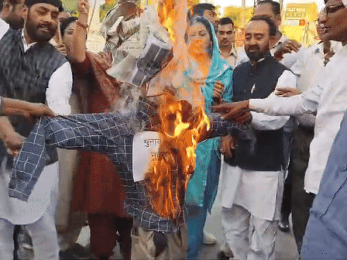 बादशाहपुर में कांग्रेस ने फूंका चुनाव आयोग का पुतला:सरकार के खिलाफ प्रदर्शन, बोले- जनता ने नकारा तो वोट चोरी किए
